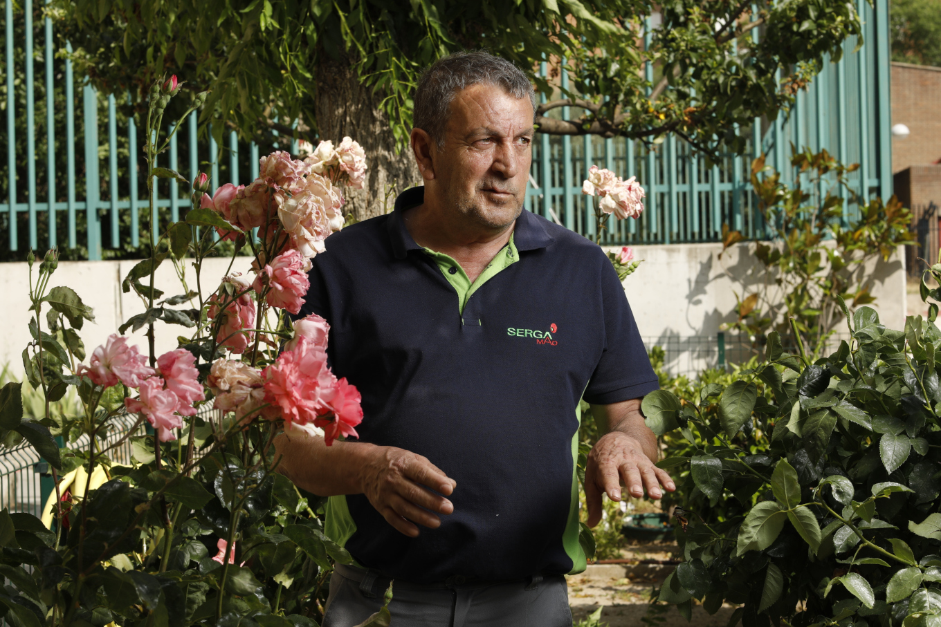 Por la valla pensamos que el jardín pertenecía a la comunidad de vecinos y que sería el portero el jardinero en la sombra. Así que entramos en el portal. Allí estaba Benito, tranquilo, con su uniforme de trabajo. Le preguntamos si era él su cuidador. Con serenidad y sin desconfianza nos contestó que sí. Le felicitamos y le pedimos si podía salir a contarnos su jardín.